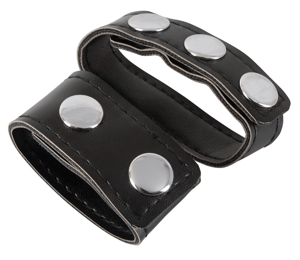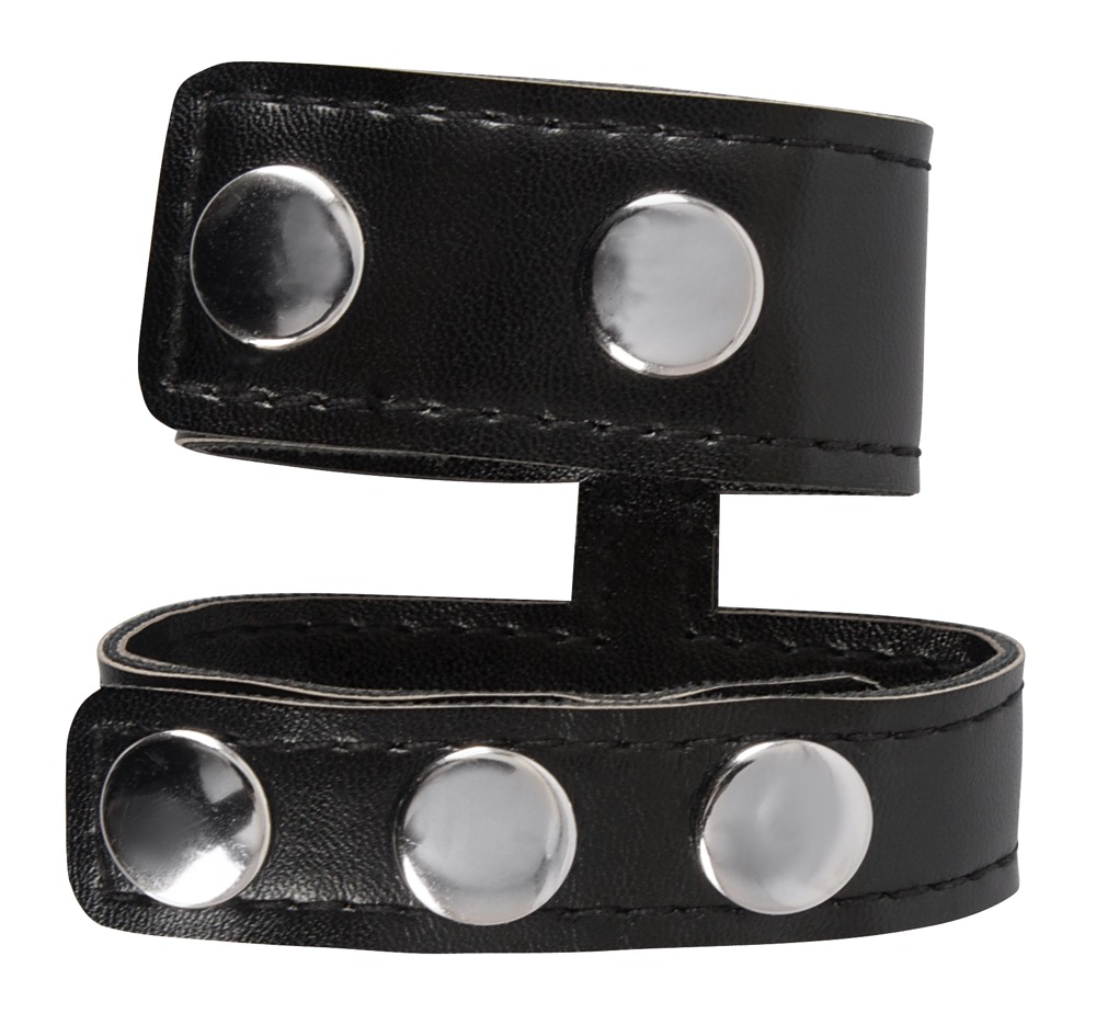 Kombinierter Penis- und Hodenriemen in maskuliner Lederoptik. Mit Druckknöpfen schnell an- und abgelegt und bequem verstellbar für perfekte Passform.