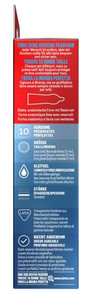 Die konturierten, hauchdünnen und transparenten Durex Gefühlsecht Extra Groß Kondome aus Naturkautschuklatex sind zurzeit die größten Kondome auf dem Markt und haben eine Easy-On Passform für besseren Sitz sowie leichteres Abrollen. Mit Feuchtbeschichtung auf Silikonbasis und Reservoir. Maße: 220 mm lang (üblich sind 180 mm). Nominale Breite 57 mm (üblich sind 52 mm).