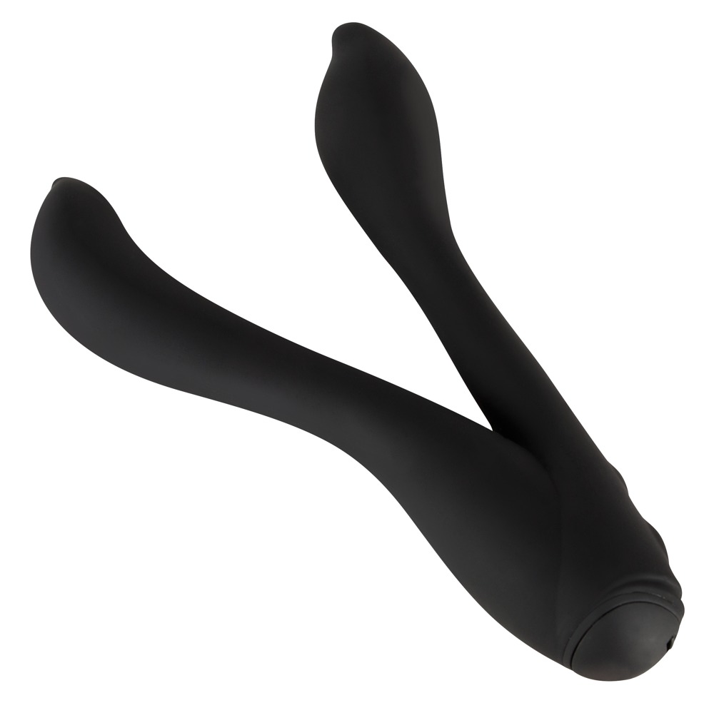 Dieser zweiarmige schwarze Vibrator besitzt gleich zwei Motoren - jeweils einen in jedem Reizfühler. Während ein Knopf bei Betätigung das Bedienfeld blau leuchtend in Betrieb nimmt, können Sie spielend leicht mithilfe eines zweiten Buttons den Vibrations-Rhythmus bestimmen. Dazu stehen Ihnen ganze 7 verschiedene Modi zur Verfügung - vom leichten Kitzeln übers Massieren bis hin zum starken, unnachgiebigen Pulsieren! Die leicht geschwungenen Arme, die am oberen Ende verdickt sind und nach unten hin dünner werden, vermitteln Ihnen dank ihrer soften Oberfläche ein unglaublich angenehmes Hautgefühl.