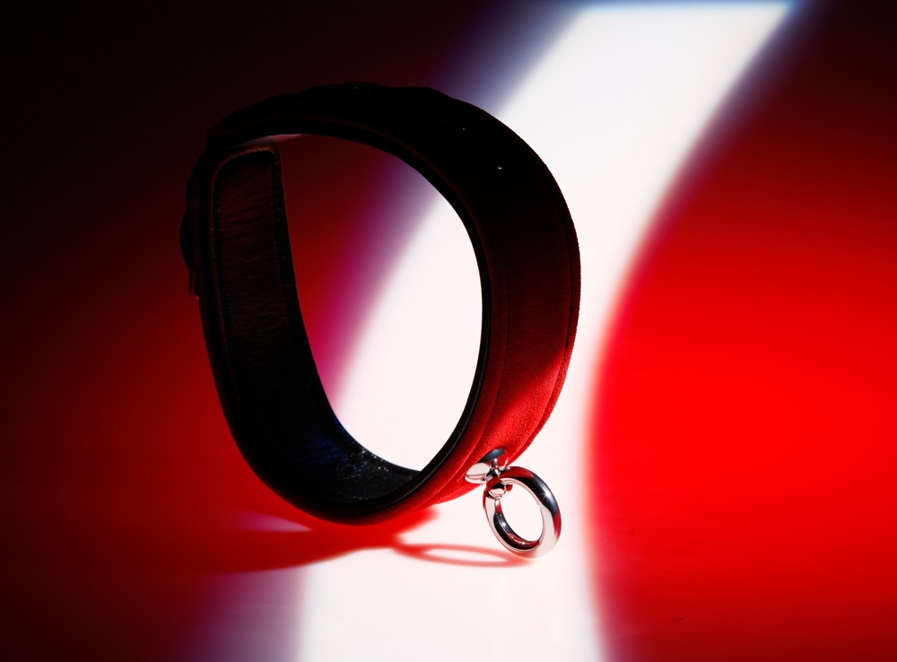 Wild und sexy! 4 cm breite, hochwertig gearbeitete Halsfessel mit dekorativem Ring an kleinem Steg. 45 cm lang, mit Schnallenverschluss verstellbar von 32-50 cm.