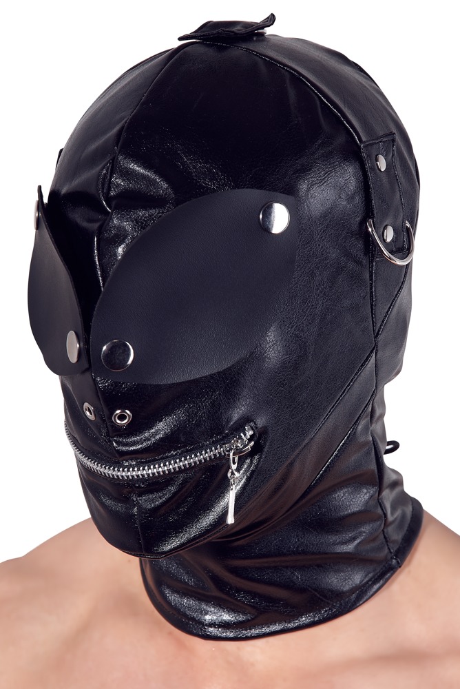 Wenn Sie diese schwarze, elastische Lederimitat-Kopfmaske tragen, werden sich einige Menschen diese Frage stellen! Die Augenklappen sind abknöpfbar und der zu verschließende Reißverschluss über dem Mund entscheidet über Reden und Schweigen. Mit zwei Ösen über den Nasenlöchern und Schnürung hinten. Zierringe oben und seitlich. 98% Polyester, 2% Elasthan mit Polyurethan-Beschichtung.