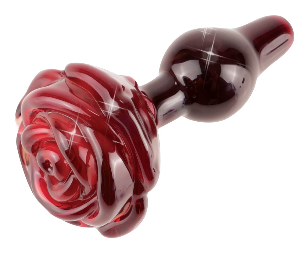 Roter Analplug aus mundgeblasenem Glas mit Stopper in Form einer Rosenblüte. Geruchsneutral, antiallergen und sehr hygienisch, da einfach zu reinigen, sogar in der Spülmaschine. Tipp: Im Wasserbad erwärmt oder im Kühlschrank abgekühlt, kann er das Lustgefühl noch zusätzlich steigern. Bei guter Pflege hält der Artikel lebenslang.